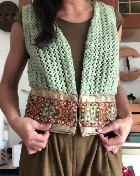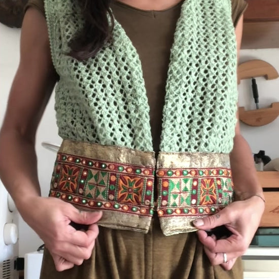 E' realizzato ai ferri, traforato e morbido di lana color menta. Al gilet è stata applicata una passamaneria indiana alta 13 cm sul giro vita che serve anche da chiusura con due gancetti invisibili per poter chiuderlo o lasciarlo aperto e così ottenere diverse vestibilità con lo stesso capo. Non è reversibile.