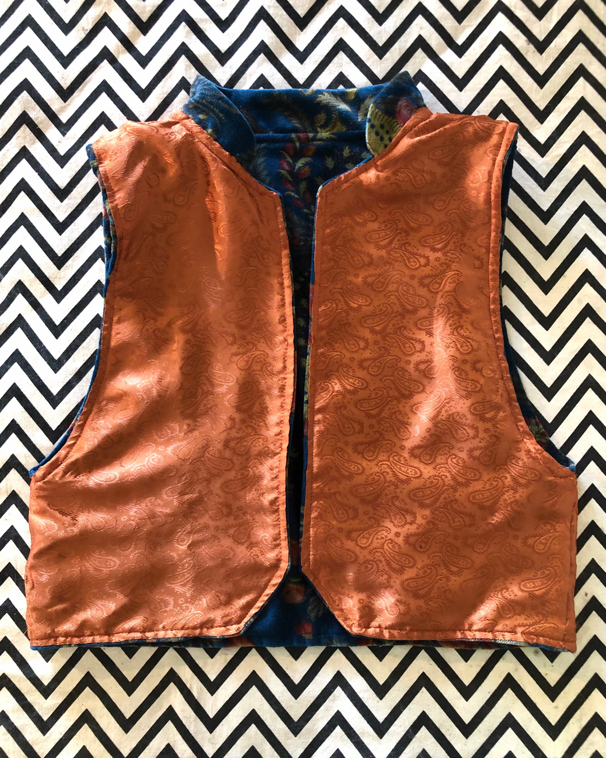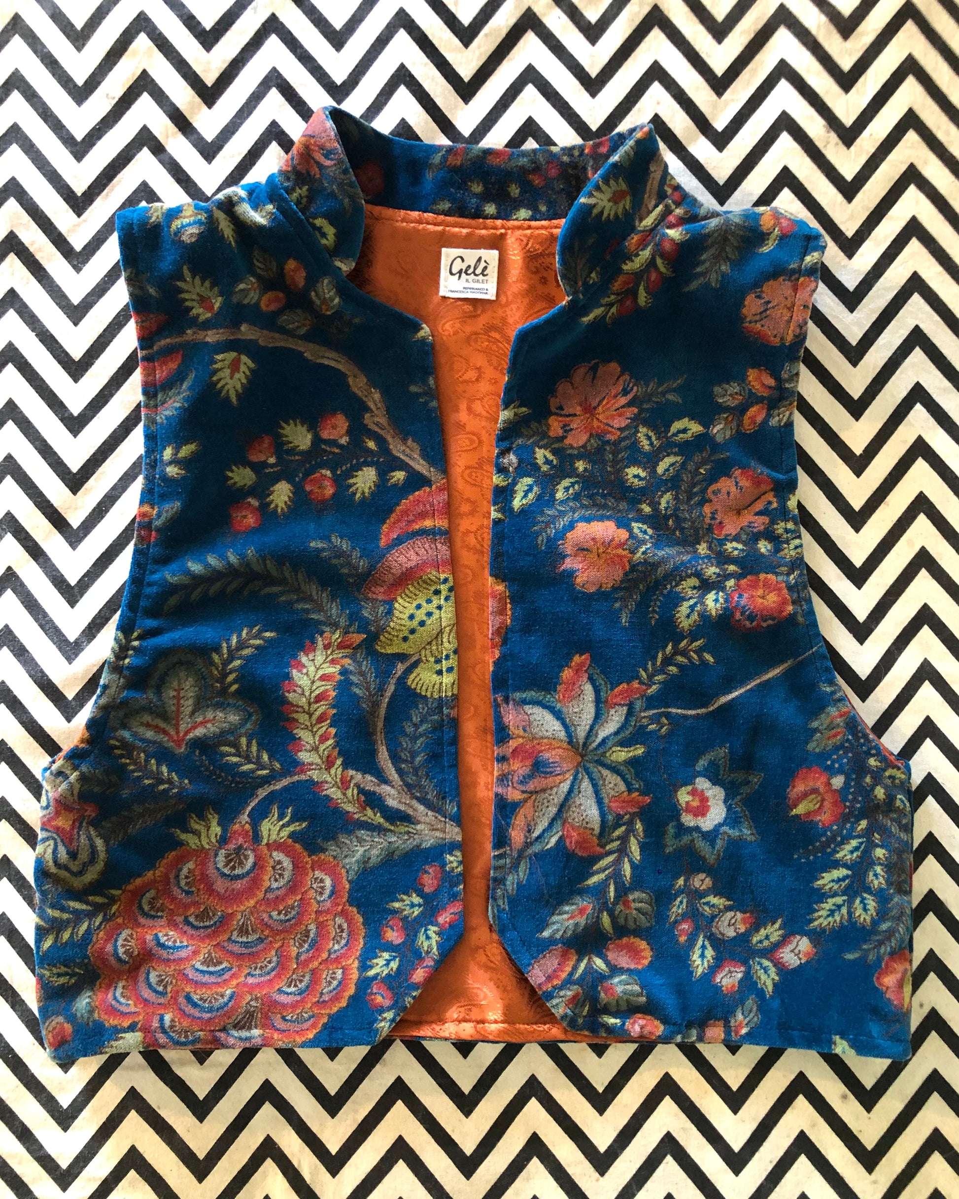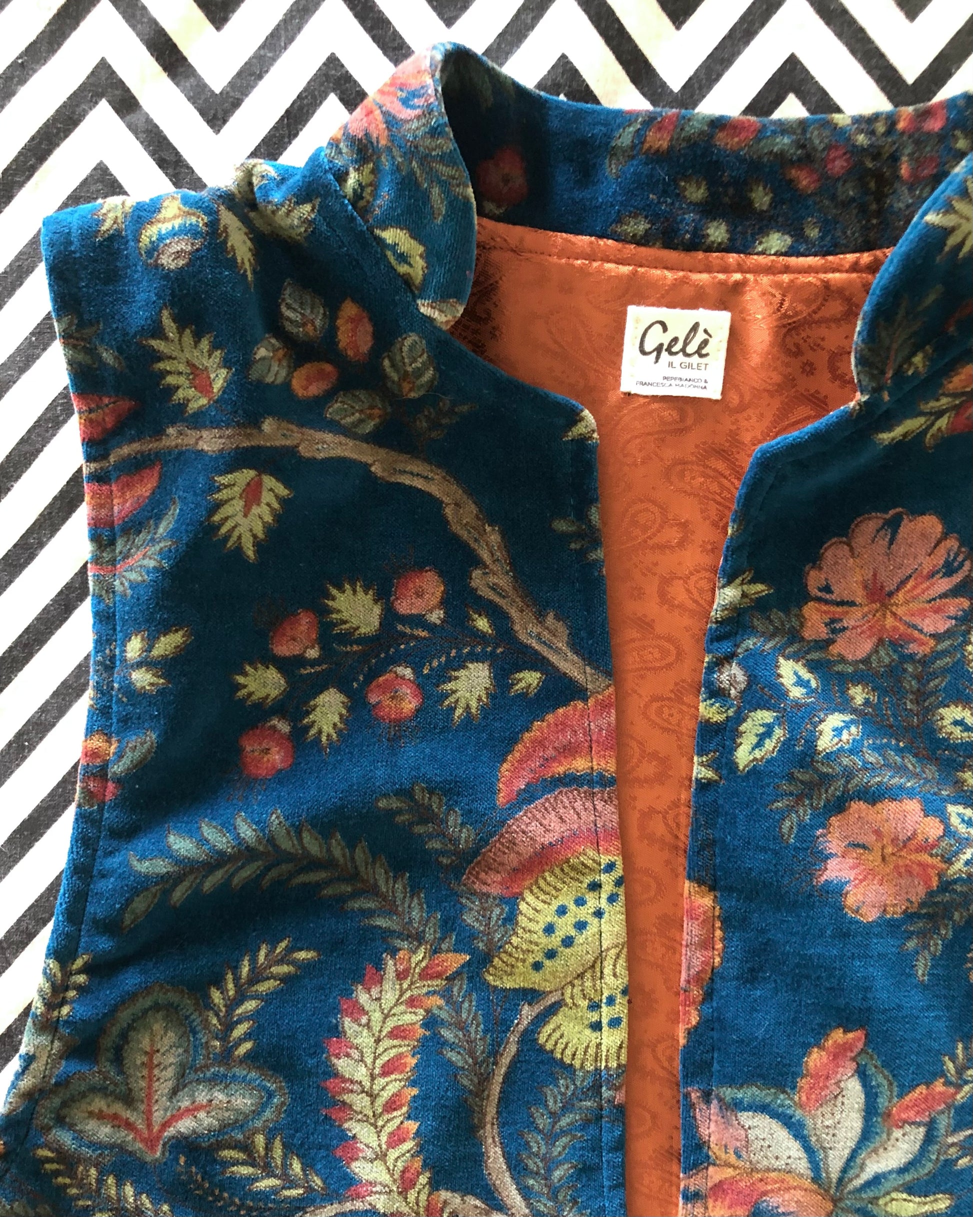 Sul lato esterno è di velluto liscio con una fantasia floreale sui toni dell'arancio stampata su un fondo turchese intenso sul lato interno ha un raso color arancio ruggine deciso. La sua particolarità sta nel modello del collo alla coreana e l'angolo smussato sul bordo inferiore delle parti davanti. Inoltre ha il giro manica ampio per poterlo indossare anche sopra un maglioncino.
