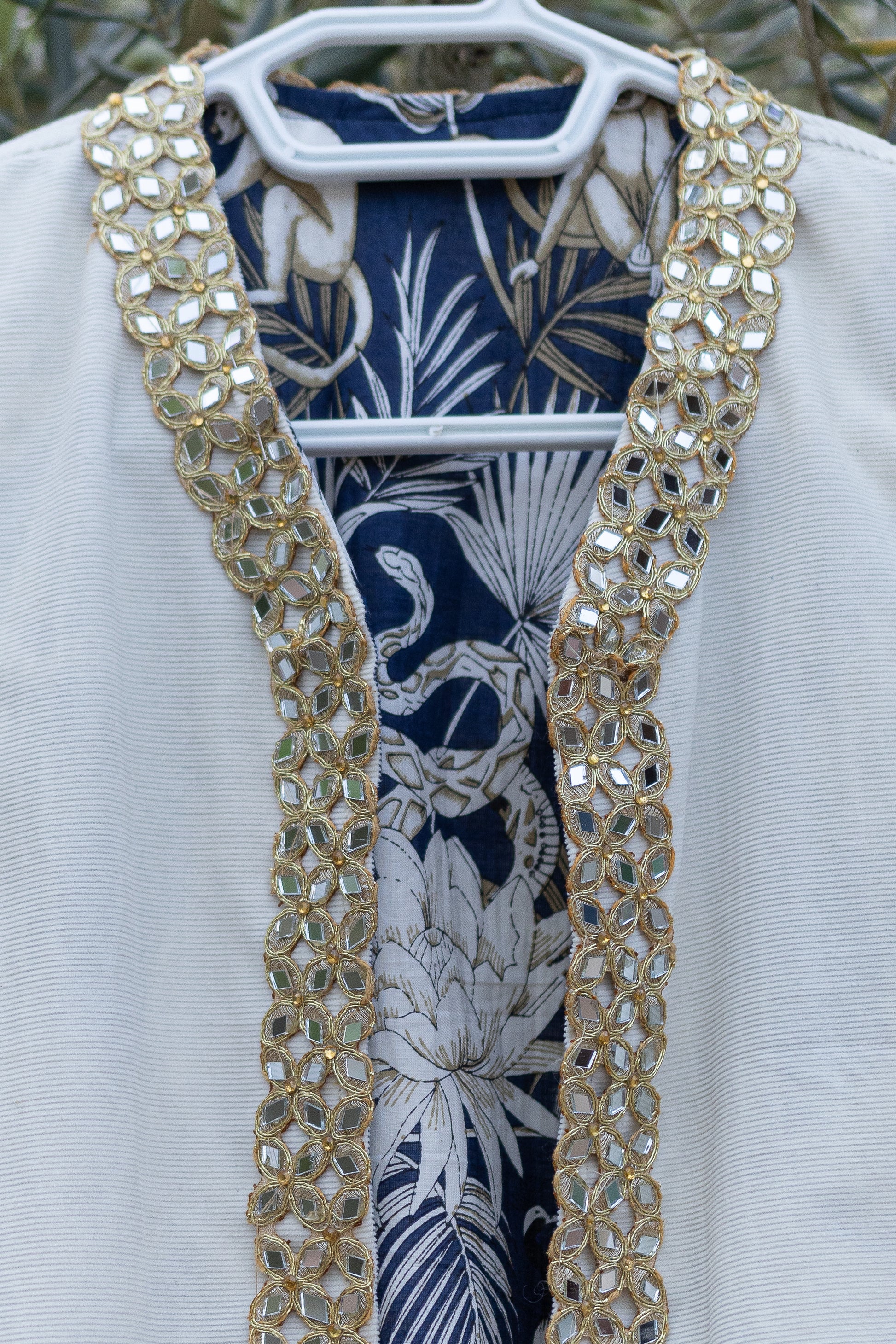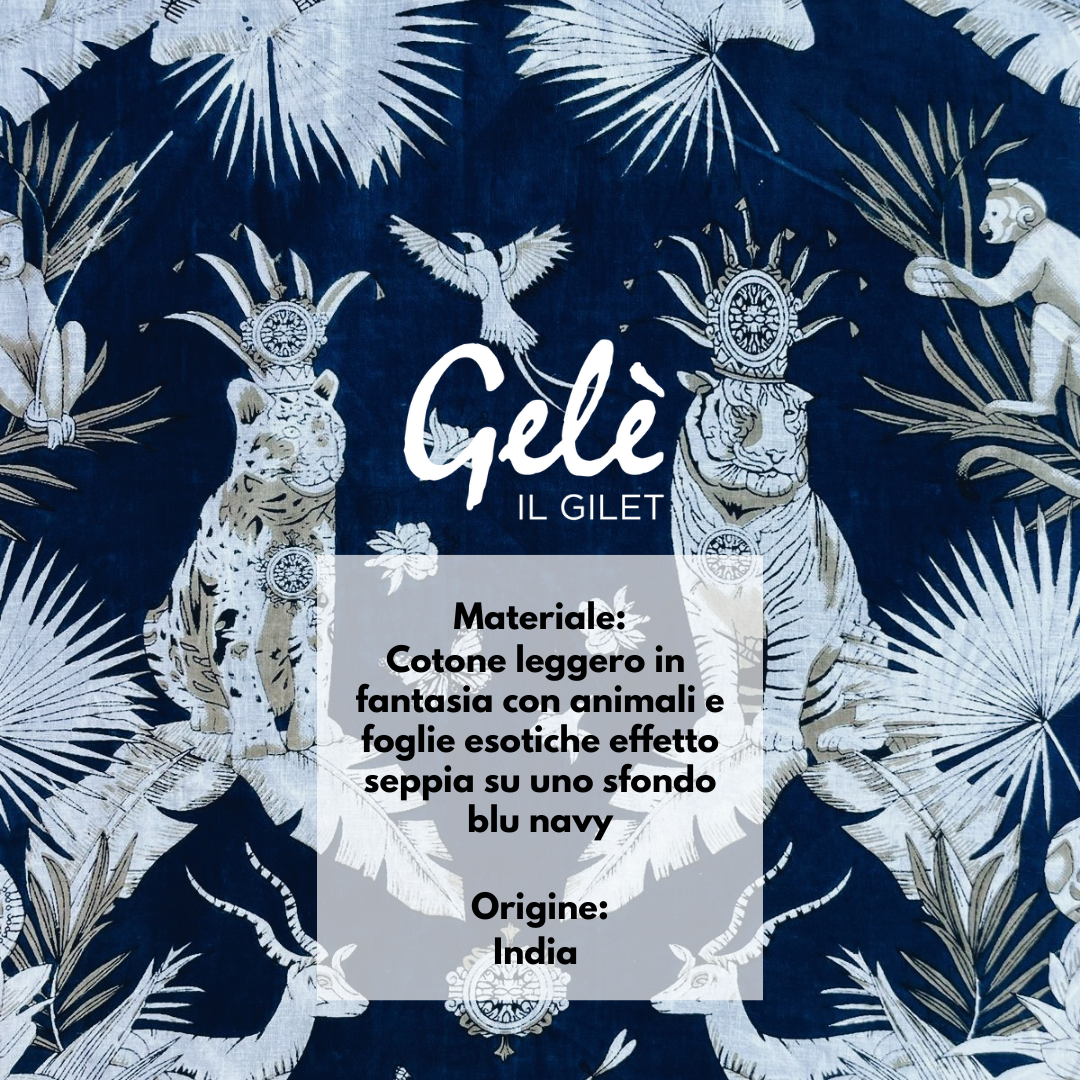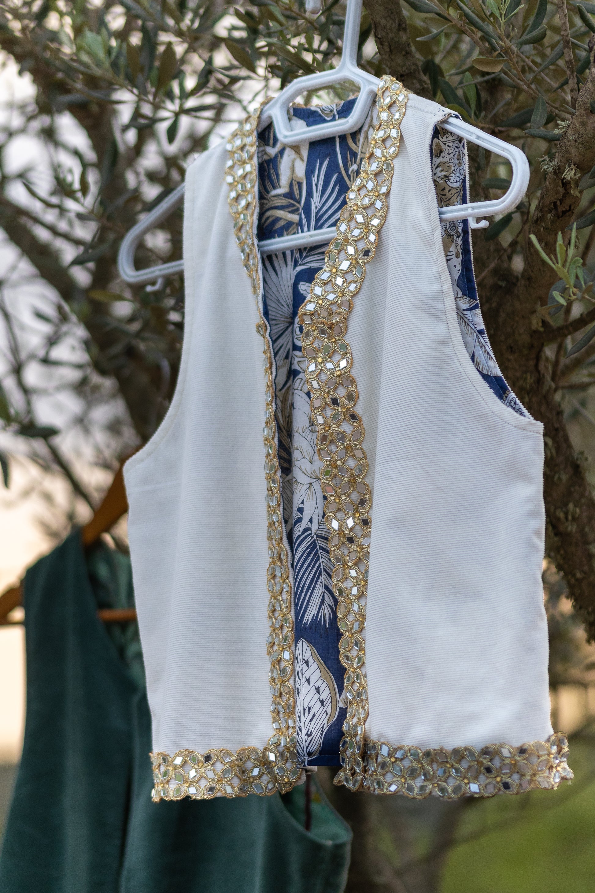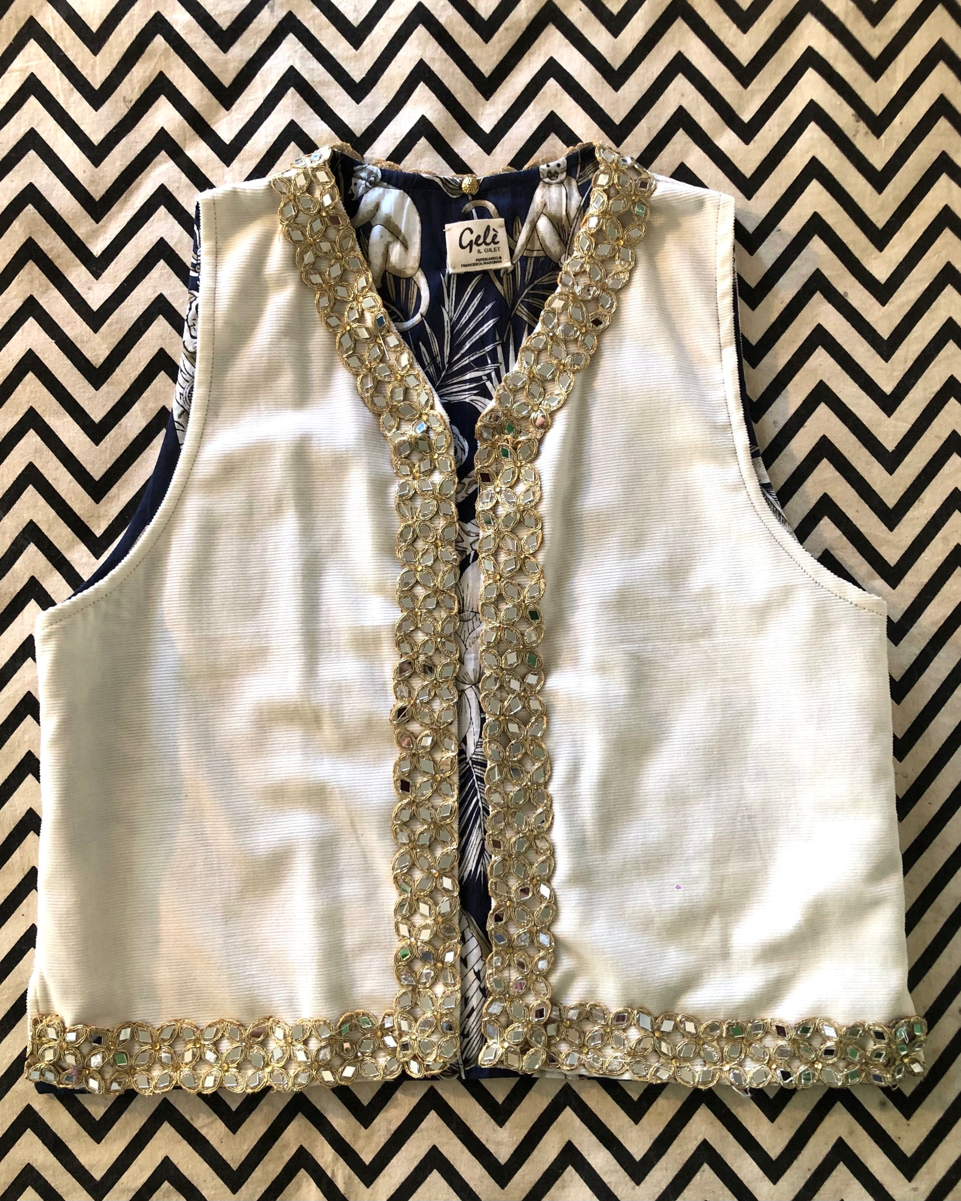 Sul lato esterno è di velluto millerighe color latte con una passamaneria indiana composta da specchietti su tutto il bordo della parte frontale del gilet sul lato interno ha una fodera di cotone blu con una fantasia con animali e foliage sui toni dei grigi.