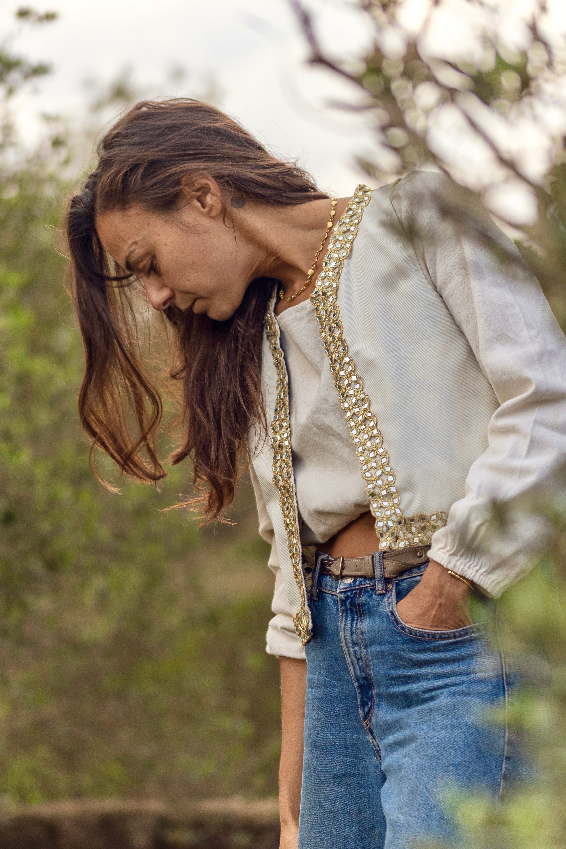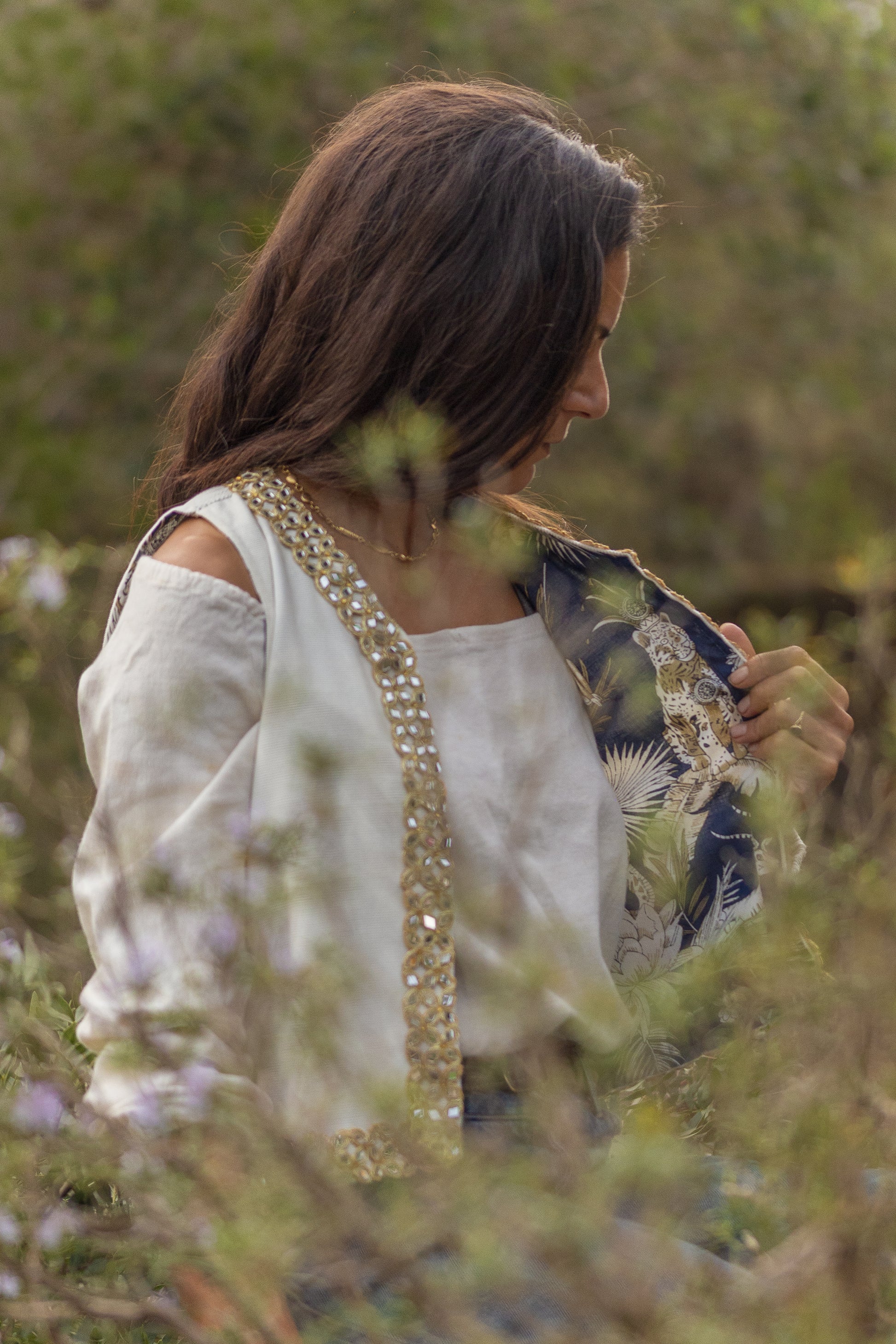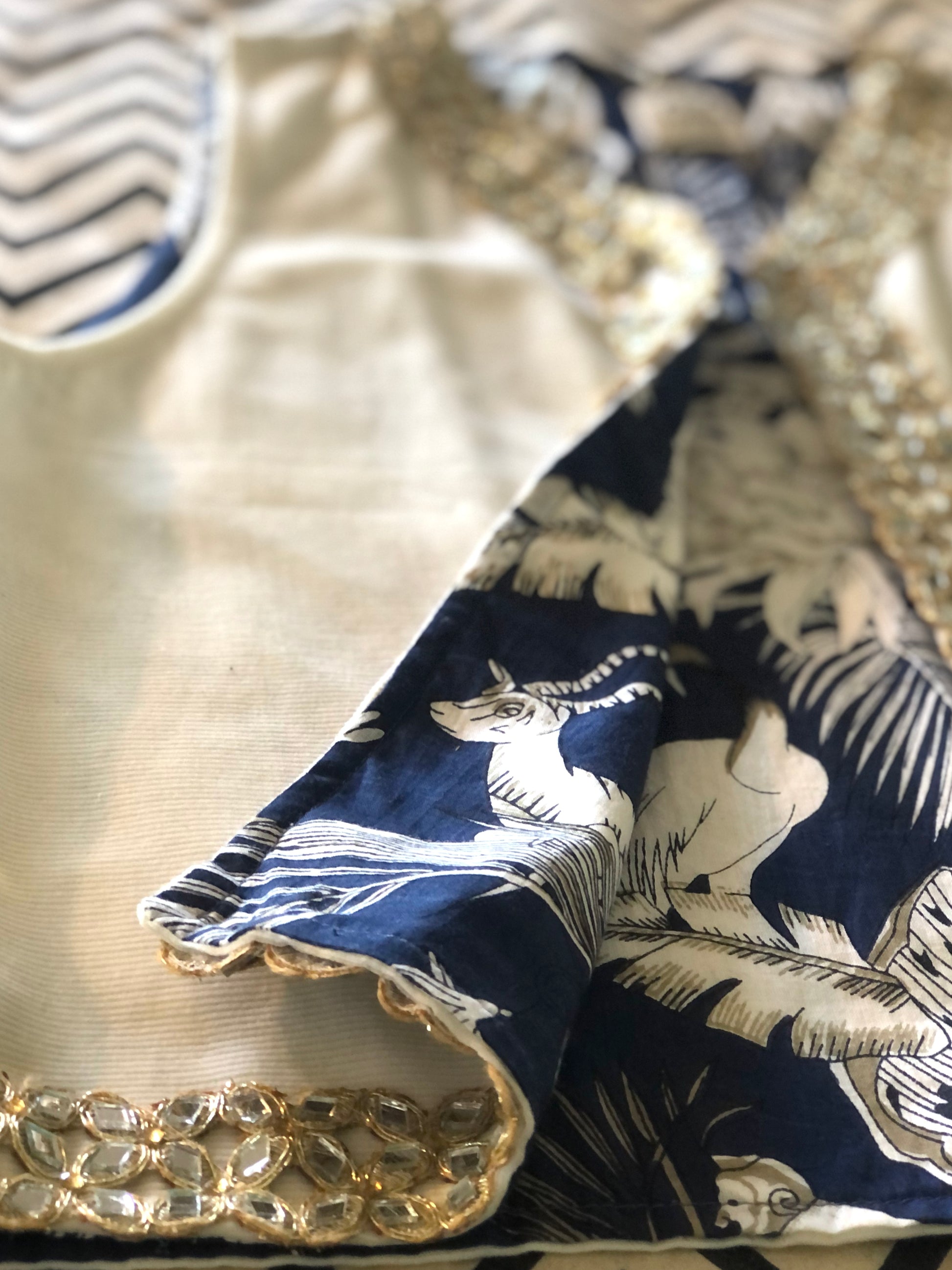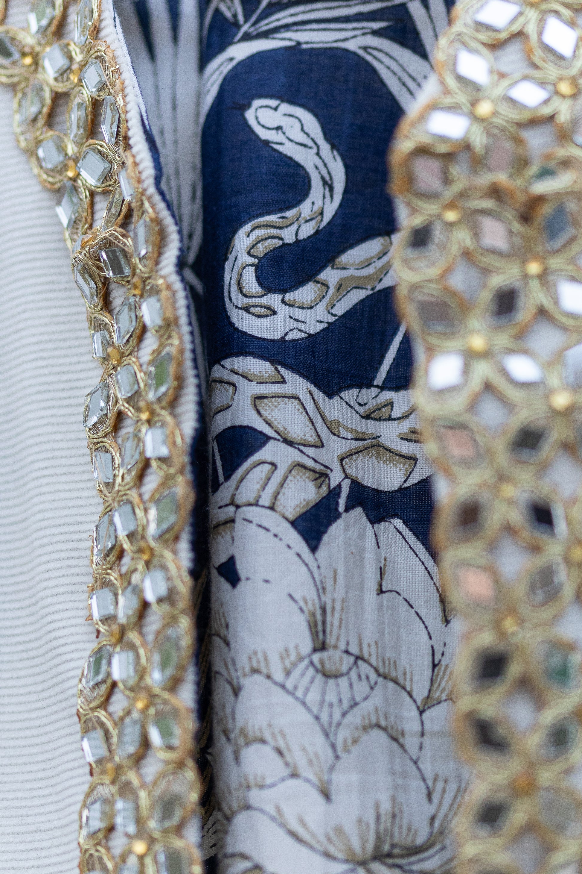 Sul lato esterno è di velluto millerighe color latte con una passamaneria indiana composta da specchietti su tutto il bordo della parte frontale del gilet sul lato interno ha una fodera di cotone blu con una fantasia con animali e foliage sui toni dei grigi.