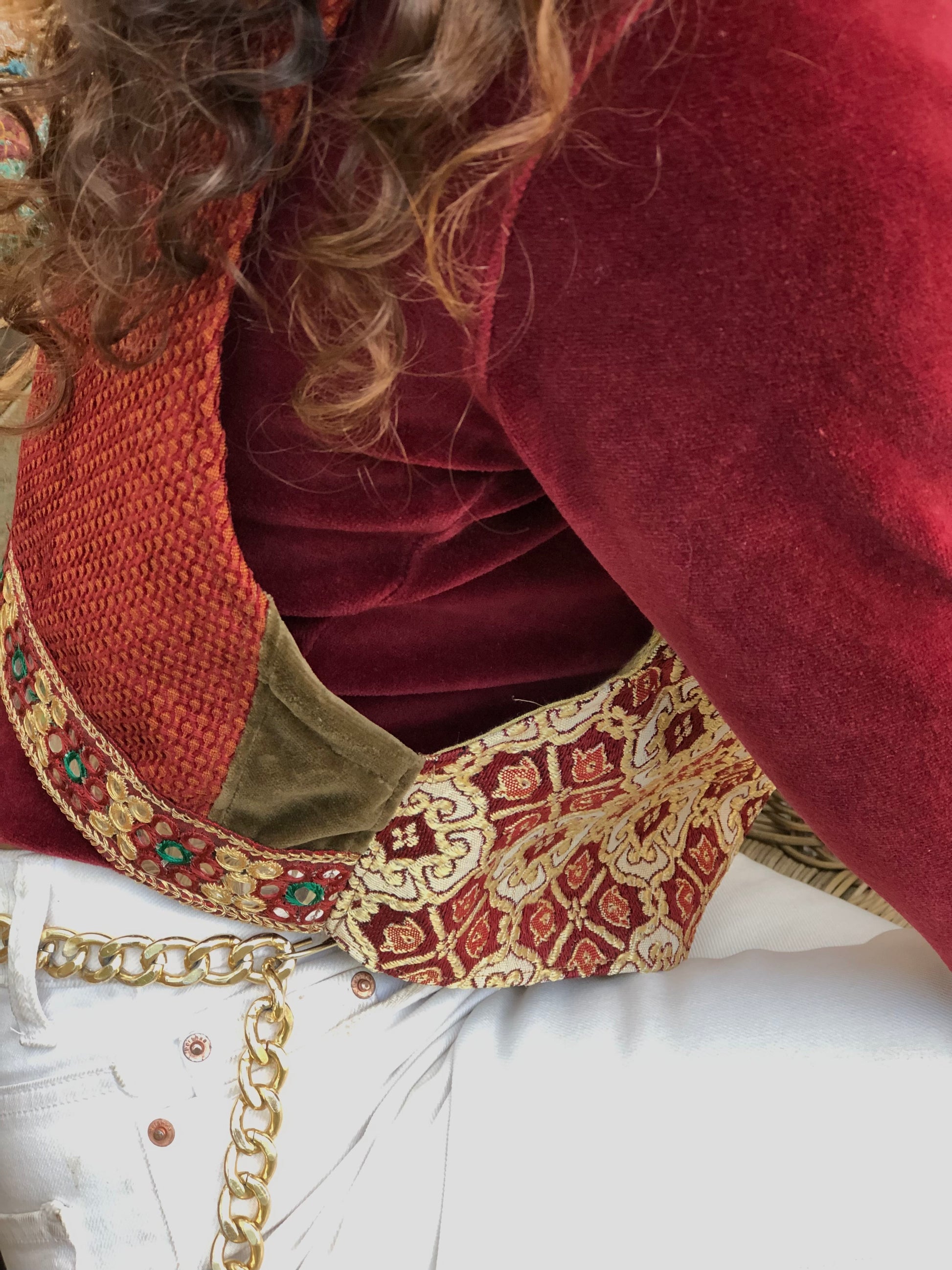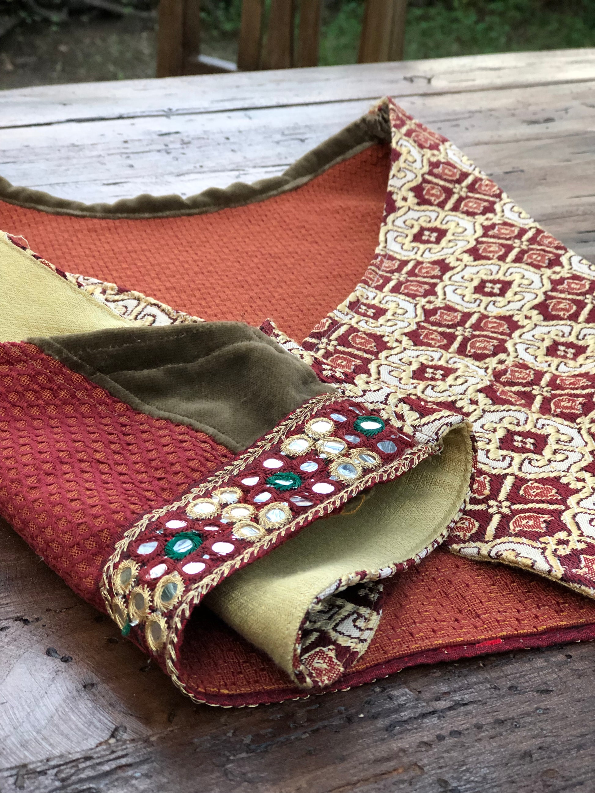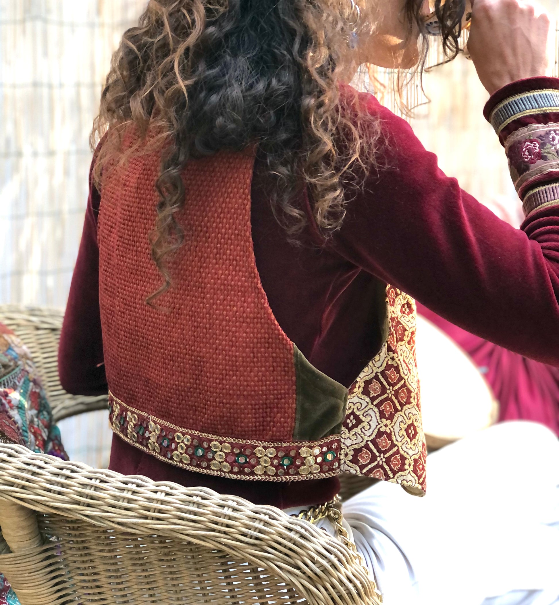 E' stato realizzato con una combinazione di scampoli ricercati di tessuto, uno marocchino e uno sardo. E' rifinito con una passamaneria Rajasthana, tipica nel nord India. L’ampio giro manica lo rende adatto ad essere indossato anche sopra un maglioncino
